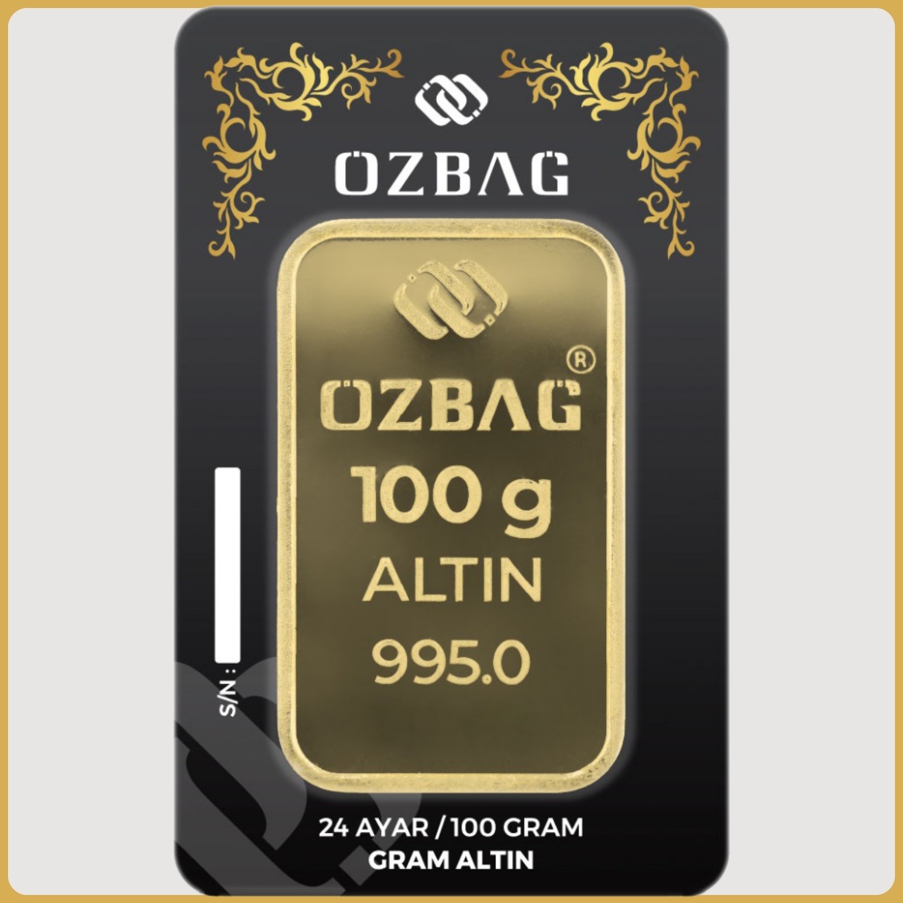 100 (Yüz) gram ağırlığında 0.995 saflığında 24 ayar altın, değer ve tasarrufun temsilcisi. Saf altının parlak ve güçlü hali, tasarruf ve yatırımın vazgeçilmezi. Saflığıyla göz kamaştırır, geleceğe yatırım yapmanın güvencesi. Sonsuz bir değeri temsil eder. Değer, güven, tasrruf; hepsi bir arada. Hayatınıza ışıltı katın, 24 ayar altınla tanışın!